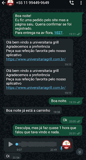 Read moreFiz um pedido pelo site hoje às 19:00. A previsão de entrega seria em até 30 minutos. Um pedido simples (um filé de frango). Como entrei novamente para acompanhar o pedido e havia sumido mandei uma mensagem para o estabelecimento as 19:11 solicitando que confirmassem se o meu pedido foi efetivado. As 19:38 me falaram que o pedido estava saindo. Esperei até as 20:31 e nada. As 20:55 pra minha surpresa mandaram uma mensagem perguntando se podiam mandar o pedido! (2 horas depois). Achei um descaso total. Além do site para fazer o pedido ser péssimo, a demora pra responder minha mensagem e a falta de atenção em conferir se meu pedido foi realmente registrado. Estou doente e precisava comer na hora certa. Primeira vez e última que tento usar o serviço de delivery desse estabelecimento. Precisa...