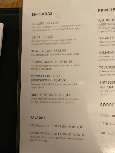 Read moreLugar agradável com ótimo serviço. Comemos como entrada uma salada de chèvre chaud, que estava bem temperada e servida, mas sentimos a falta de croûtons ou pão. No prato principal, magret de canard que estava no ponto certo e muito bom e um entrecôte au poivre vert, que estava no ponto certo (ao ponto para menos), mas o molho de pimenta estava demasiadamente forte, pois impede de sentir o sabor da carne. Era tão forte que lembra mais pimenta malagueta que pimenta do reino verde, que costuma ser mais fraca que a pimenta do reino preta e seca. Para redimir o restaurante, os garçons avisaram que o molho era forte, mas descartei os avisos pois já comi em outros restaurantes franceses pratos com esse molho que eram bem mais suaves que esse. Além disso, a batata frita que acompanhava o prato era razoável, pois estava um pouco dura. O vinho que tomamos acompanhando os pratos estava bem saboroso e com preço...