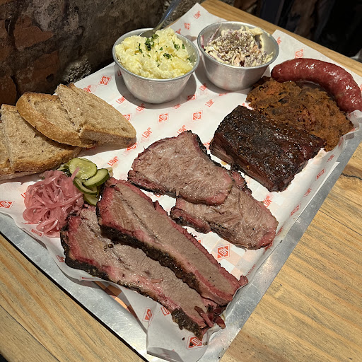 As carnes têm texturas distintas e bem trabalhadas, sendo o brisket macio, com camadas de gordura derretidas que realçam sua suculência; o cupim com uma consistência mais densa, com fibras longas que desmancham na boca; o pulled pork, desfiado e suculento, com um leve dulçor de especiarias, complementado pela defumação persistente; as pork ribs combinam carne tenra que se desprende facilmente do osso com um leve toque caramelizado na superfície; a linguiça artesanal se destaca pela textura firme e tempero marcante.