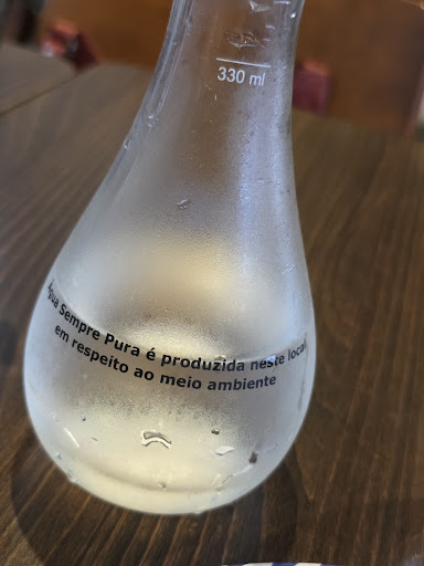 Para minha surpresa, a água (que não é gratuita ou "da casa") foi apresentada como tal, e, ironicamente, o copo ainda apresentava uma informação bizarra dizendo que "a produzem no local".