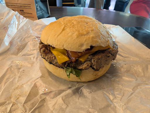 Read moreUma ótima opção para comer no aeroporto, pela comida ser deliciosa e manter o mesmo preço dos restaurantes da franquia, um pouco caro, mas vale a qualidade. Comi um hambúrguer com salada tradicional, e estava ótimo, batata frita quentinha e crocante. Ambiente apertado, ruim de se locomover, e lotado, em um domingo no horário do almoço, mas consegui um cantinho pra sentar e comer, a rotatividade é alta, as mesas são compartilhadas, tinham pessoas limpando as mesas enquanto eu estava lá, pessoas em grupos talvez não consigam sentar todas juntas. Além de ser ótimo darem a previsão de tempo que ficará pronto, antes de você fazer o pedido, em telas dispostas na frente do restaurante (demorou 7 minutos o meu), dando para se organizar porque cumpriram com o tempo estimado, e achei super rápido. Os totens são fáceis de mexer para fazer o pedido, tinha uma pequena fila, mas foi rápido. Válido para chá de...