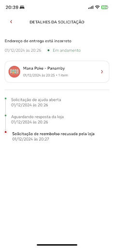 Read moreRealizei meu pedido pelo ifood as 20:25, um minuto depois 20:26 solicitei o cancelamento para trocar o endereço, as 20:27 a loja recusou meu pedido de cancelamento. Ao falar com eles no chat as 20:29 depois de ter tentado cancelar novamente, alegaram que não poderiam fazer nada e que eu precisava solicitar o cancelamento com o ifood. Expliquei que ja havia solicitado mas eles haviam recusado e eu não tinha mais opções a não ser a loja ajudar, eles alegaram que não poderiam pois meu pedido ja estava pronto (o que não era verídico dado que faziam 6 minutos que havia pedido e no app não constava essa informação e sim que ainda estava sendo preparado).Tentei ligar e após falar no telefone com atendente esperei o retorno pois disse que ia tentar cancelar para que eu pedisse de novo. depois de uns minutos o atendente disse no chat que não poderiam fazer nada, o pedido havia sido mandado para entrega no endereço errado mesmo e eu precisava falar com o entregador para ver se pagando um valor a mais para ele, ele viria até o endereço certo. Como eu não estava no endereço e não conseguia buscar, a loja cancelou o meu pedido e meu reembolso foi recusado. Agiram de má fé recusando um pedido de cancelamento que é direito do cliente, começaram a preparar sabendo do pedido de cancelamento e enviaram para o endereço errado sabendo que eu não ia conseguir buscar. Fui prejudicada e agora estou tomando outras...
