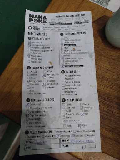 Cardápio variado e criativo: O Mana Poke Panamby possui um cardápio diversificado que atende diferentes preferências, com opções tanto para quem gosta de sabores mais tradicionais quanto para os que preferem algo mais inovador. As combinações de toppings são criativas, permitindo que cada cliente monte seu prato conforme suas preferências. Além disso, o restaurante oferece algumas opções de bowls exclusivos que combinam perfeitamente com a proposta saudável do local.