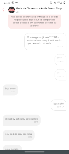 Pedi as 20:52 de hoje , com previsão para 21:58 , vi que não aparecia que o enntregador saiu mesmo depois de ter dado 21:58 , fui mandar mensagem para a loja para saber o que tinha acontecido , aí me falaram que o motoboy tinha pego o pedido e logo em seguida cancelado o pedido e disseram que ele tinha extraviado , como estava esperando a bastante tempo , me estressei pelo fato de não terem me avisado quando aconteceu , pois então tiveram coragem de falar que só tinha aparecido que ele cancelou naquele momento que eu mandei a mensagem . A moça me mandou novamente o pedido e disse que ia chamar outro motoboy. O que achei estranho foi que no exato momento que ela falou que tinha saído o pedido apareceu no ifood que o motorista estava a caminho , o mesmo motorista . Quando ele chegou perguntei se o nome dele era Gustavo pq estava com esse nome e mostrei a FT, e ele disse que era ele , aí perguntei pq demorou tanto e ele disse que ficou 1 HR esperando e foi perguntar falaram que não tinha nenhum pedido para sair , ou seja jogaram a culpa para o cara sem se preocupar as consequências , pq se eu tivesse reclamado no ifood , ia prejudicar o cara , mas não se importaram . Achei muita irresponsábilidade , e falta de empatia com o próximo não voltarei a pedir nesse mania , experiência horrível ,nota 0...