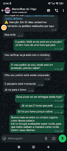 Read morePéssima experiência! Motoboy liga dando comandos para não ter que esperar na triagem do condomínio, desci antecipadamente por empatia e fiquei esperando mais de 30 minutos, ele ainda chegou dizendo que a culpa era da triagem do condomínio sendo que a portaria estava VAZIA! Pedimos a pizza de rúcula 2, com tomate seco e queijo de búfala, era qualquer tipo de queijo velho, menos de búfala. A outra pizza que era meia frango com catupiry e meia chocolate com morango, virou toda de chocolate, pois o chocolate veio esparramado e se não bastasse isso, fizeram com todas as bordas de chocolate. Sendo que especifiquei e paguei a mais para ter a borda de catupiry do lado salgado e a de chocolate do lado doce. Primeira e última vez, não se compara com a pizza da antiga empório Almeida....