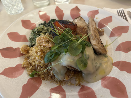 Nós comemos sororoca grelhada com purê de alho com salsinha,, arroz de taioba e tomates e uma farofa de ovas de tainha com limão que estava incrível. [ Melhor farofa que já comi ]. De sobremesa um merengue leve com pistache e alguma fruta vermelha que estava tão bom que não deu tempo de tirar foto.