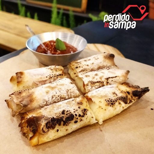 De entrada, ainda experimentei os gostosos PEPPERONI ROLLS (R$ 15): rolls de massa filo recheados com pepperoni, mussarela e catupiry, e acompanhados de molho de tomate com manjericão.