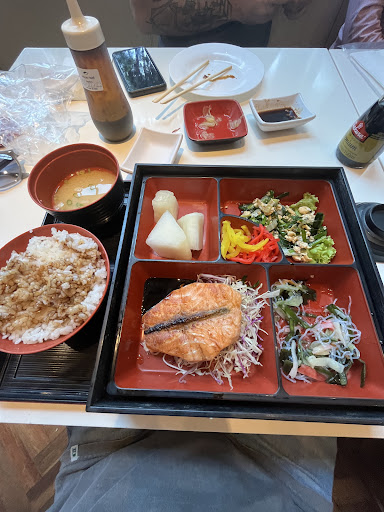 An upscale, contemporary Japanese restaurant with various types of sushi served on a conveyor belt.