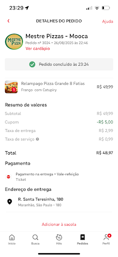 Read morePedíamos praticamente toda semana, porém, as últimas vezes nos fizeram desistir de sermos clientes. Uma x mandaram sabor da pizza totalmente errado, e ao reclamar a atendente foi extremamente grossa, e o outro problema, foi com a entrega, pedimos durante a madrugada, a pizza não chegava nunca, qdo ligamos pra saber a atendente pra variar foi muito grossa e disse q o motoboy tinha vindo entregar e viu as luzes apagadas e foi embora. Pois bem, quem fica com as luzes de casa acesa na madrugada, e ele nem sequer tocou a campainha. E ao invés de se desculpar e enviarem novamente não se dispuseram a fazer isso é acabamos cancelando o pedido. Sou o tipo de pessoa q antes de pedir comida, sempre pesquiso aqui e nos comentários do ifood. E na minha opniao, atendentes q discutem com o cliente ao invés de tentar resolver o problema, pra mim não serve, não me passa credibilidade e nem interesse do estabelecimento em manter...