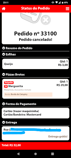 Faz anos que eu sou cliente da pizzaria, sempre indicava para todos. Hoje 22/03 fiz o pedido pelo app como de costume. NÃO É COBRADA A TAXA DE ENTREGA. Fiz o pedido como sempre, e como podem ver na foto anexada abaixo, consta ENTREGA GRÁTIS!!! Depois de muito tempo entraram em contato comigo via whatsapp informando que o motoboy estava saindo mas que eu teria que pagar a taxa de entrega de 4,00 reais. Descordei e expliquei que no app consta que é grátis, informei que eu era cliente a anos e nunca tive que pagar, e que se houve alteração eles precisavam atualizar o app para não ter esse constrangimento para o cliente. Eles ao invés de contornar a situação e abrir uma excessão, se desculpar pelo app estar desatualizado e informar que dessa vez não seria cobrado pois EU NAO TENHO CULPA SE NO APP ESTÁ UMA INFORMAÇÃO DESATUALIZADA!! e que iriam corrigir e da próxima seria cobrado, da próxima iria constar no app etc ... Não, simplesmente falaram ok o seu pedido foi cancelado. No mesmo momento o meu filho começou a chorar, querendo a pizza, mandei msg falando que ele estava chorando e que podia entregar, mesmo discordando eu ia pagar... Me falaram que o motoboy voltou e que se eu quisesse iam refazer o pedido mas eu teria que aguardar rota para meu endereço. Enfim, total descaso da parte de vocês! Poderiam ter solucionado o "problema" informando que foi erro do app e que irão atualizar, mas que dá próxima eu já estaria ciente. Preferiram simplesmente cancelar, perder o cliente e nem se desculparam pelo ocorrido. Pela falta de informação no app, pela mudança que não foi atualizada!!!