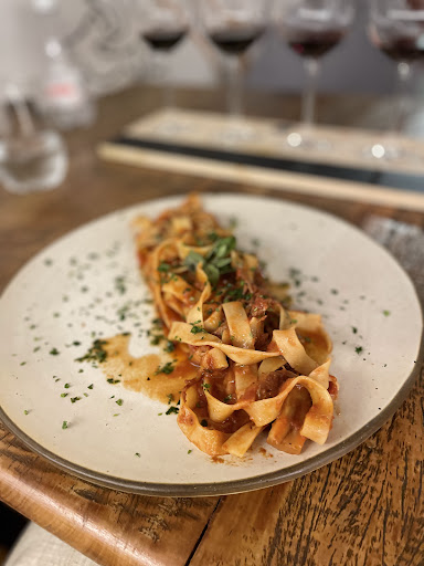 Escolhi o Wine Flight “Viagem ao velho mundo” composto por 4 rótulos tintos, sendo um da região de Dão, um Barollo, um espanhol da região de Castilla y León, e um francês de Bordeaux em que as taças são servidas com exatos 50 ml de vinho. Uma seleção bastante interessante de vinhos encorpados e de alta qualidade, no entanto ainda não consegui formular minha opinião sobre o Coravin, tenho a impressão de que não consegui identificar os aromas como faria com a abertura recente da garrafa. Para acompanhar escolhi o Fettuccine com Ragu de Costela, que foi um pouco decepcionante, visto que estava na expectativa de experimentar algo muito bom no acompanhamento de vinhos de prestígio. Tanto o molho de tomate, usado no ragu, quanto a massa, me pareceram produtos prontos de mercado. O molho do ragu estava com acidez elevada do tomate e salgado demais, no entanto a massa e a costela estavam no ponto correto. Um prato mediano em questão de sabor mas com uma boa apresentação. A porção é servida em quantidade mais que suficiente. O vinho que mais gostei e que achei que harmonizou melhor com o prato foi o exemplar Barolo.