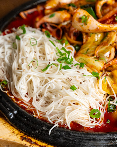Carro-chefe, o bulgogui (R$199,00) vem com fatias finas e macias de contrafilé, marinadas no molho de soja, óleo de gergelim, pera, mel e especiarias. A cocção na chapa mantém a suculência da carne, enquanto o caldo nas laterais evita que a marinada caia, queime seus açúcares e traga notas amargas. O resultado é um equilíbrio entre o umami da soja, a doçura sutil da pera e do mel e o leve tostado do gergelim.
