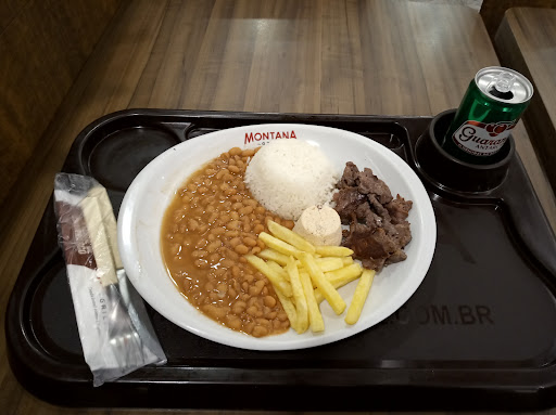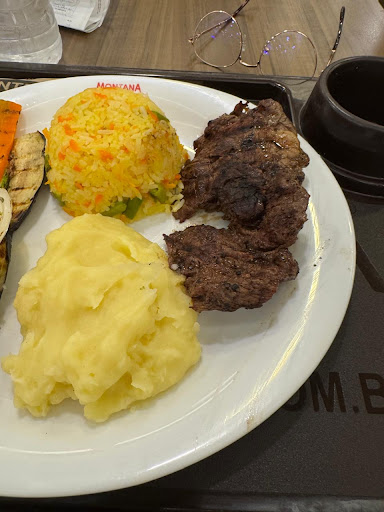 Carne horrorosa, pagar R$ 50,00 em um beef Prime 220g que na foto do anuncio é um corte padrão de mercado e ai voce recebe o prato com a horrível carne da foto. Joquei fora tudo, tinha muito nervo e olha o aspecto da carne, tirem suas conclusões. Isso porque pedi a carne ao ponto mas olha o resto de bife que fizeram para mim. E olha que esse é um dos "melhores" cortes deles. O Arroz a grega não foi feito no dia, quem cozinha no dia a dia sabe quando o arroz vem sendo requentado e fica molenga como o da foto. Enfim, agora entendo porque os restaurante da praça de alimentação do shopping cheios e apenas a Montana sem ninguem pedindo.... observem de perto na foto o...