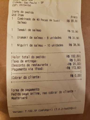 No dia 06/09/2025, realizei um pedido de 40 peças de sushi pelo aplicativo Rappi, referente ao restaurante Morumbi sushi. E o pedido nunca foi entregue.