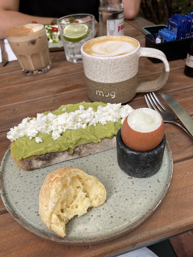 Cozy, quaint and surrounded by trees, this is the perfect setting for a brunch with friends. I ordered the Avocado toast which was good but not great. It almost tasted like a store bought quac though I was assured it was made fresh that day (not a chunk of avocado to be found). I ordered my soft boiled egg soft with a runny told but it was over cooked and had a solid middle. The cafe latte with oat milk was excellent and arrived hot- so good I ordered a second. And the banoffee I saw on the menu and just had to get, was also very good but bordered on being too sweet, but I suppose that’s the point! The giant pão queijo also arrived warm and was stunning! All the breads and focaccias are made on premises. Lovely atmosphere and music low enough to hear conversations at our table and the one...