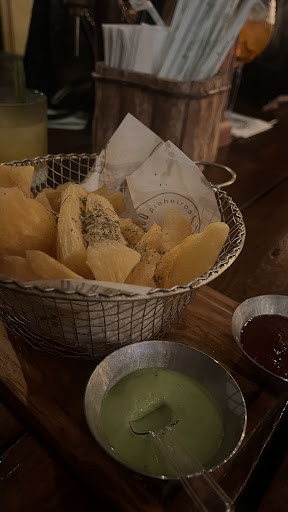 A porção de macaxeira frita não tinha quase nenhum gosto ou tempero. Os molhos foram a salvação e nem eram tão bons. O bolinho de costela era muito bonito por fora e crocante, só que o recheio era seco. O queijo empanado estava muito oleoso e também não trazia nada de impressionante. Os drinques são caros pro que entregam, mais bem apresentados do que realmente saborosos. Deveria ter ficado na cerveja.