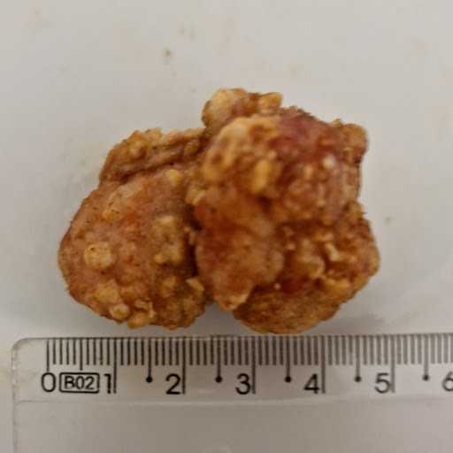 Chego em casa e abro. E rapaz, o pedaço de frango, a tal unidade, tem literalmente 5 cm. É sério? Eu peguei a régua pra não parecer que eu tô mentindo.