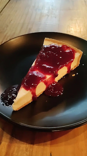 De sobremesa pedi a torta de cheesecake de frutas vermelhas. Era apenas boa.