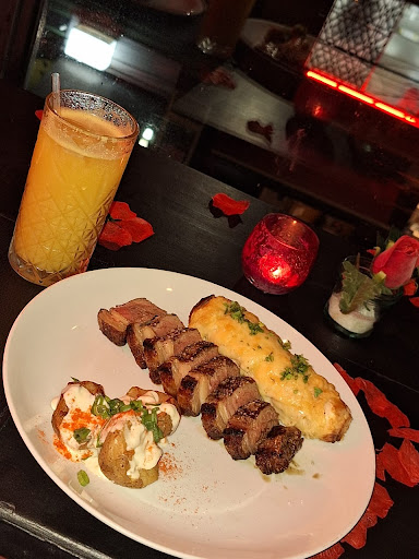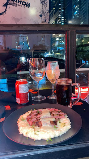 Read moreFui comemorar meu casamento, apenas eu e meu marido. Reservamos a mesa LOVE, onde pagamos 100 reais apenas para ter um local reservado, com algumas pétalas artificiais e UMA vela na mesa kkkkk olha, sinceramente, se arrependimento matasse... Bom, chegamos às 18:00 e fomos levamos para o último andar, na área reservada, o primeiro problema era que estava UM FORNO. Era um dia quente e eu desejei abrir as janelas mas o garçom advertiu que estragaria toda a decoração da mesa. Como paguei caro e não era nem reembolsável ou gastável em consumo, ficamos DERRETENDO naquele cúbiculo. Pedi um drink recomendação da casa, já não lembro mais o nome, e estava bom. Bem refrescante. Meu marido optou por um chá com whiskey. De entrada pedimos batatas rusticas com paprica picante, estava boa, mas nada sensacional. Dá pra fazer em casa tranquilamente. Para o prato principal pedi um risoto de camarão GG, que REALMENTE são GG, e com tomates cerejas. Infelizmente o gosto do tomate se sobressaía demais, e roubou todo o sabor do prato. Me arrependi de ter escolhido esse. Meu marido pediu risoto com carne, tbm não lembro mais o nome do prato. Estava gostoso. Depois pedi um suco de laranja com morango, achando que ele seria uma cópia minimamente parecida com o laramora do Outback e mais uma vez me arrependi. É apenas um suco misturado. Não pedimos sobremesa porque já que tínhamos nos arrependido de quase todos os pratos, fomos comer a sobremesa em outro lugar kkkkk um que a gente tinha certeza que seria bom. Olha, o preço é salgado - gastamos quase 500 reais nesse jantar - e não é tudo isso. A casa tem ÓTIMOS drinks, então acho que deve funcionar melhor como bar do que como restaurante. O atendimento é bom, e a privacidade é legal, desde que não esteja um calor de 35 graus. O local é bonito pra fotos, principalmente à noite. Saímos por volta das 20:30 de lá. Mas infelizmente é só....