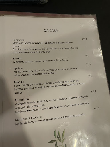 Comida: pedimos 1 pizza meia 4 queijos e meia outro sabor qual não me recordo. Ambos sabores estavam muito bons, e para 2 pessoas 1 pizza serve bem. (8/10); Possui uma extensa cartela de vinhos dos mais acessíveis (a partir de 50$ em média) ao de maior valor. Vinhos de diversos países, qual pedimos a sugestão do garçom que foi extremamente prestativo e atencioso ao nos receber e sugerir o vinho da noite. (10/10)