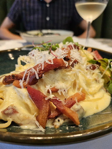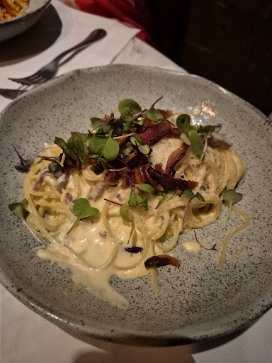 Dos piores jantares que tive nos últimos tempos. O lugar é lindo, convidativo. O menu traz opcoes clássicas e algumas mais criativas da culinária italiana. E os pontos fortes terminam por aí. De entrada pedimos um vitello tonatto com alcaparrones. Começa errado quando anuncia um ingrediente e vem outro: no lugar das alcaparras gigantes, vieram mini alcaparras, completamente insossas. O vitello estava mal temperado, o atum estava diluído, a alcaparra nao tinha gosto de nada, o prato estava sem sal e sem acidez. Resultado: uma entrada completamente tediosa e insossa, sem nenhum sabor. A outra entrada foi o couvert, uma boa focaccia (que mais parecia um brioche), mas leve e fresca. Os pratos principais foram um desastre. O carbonara foi dos piores carbonaras que já comi na vida. Apesar de supostamente seguir a receita tradicional, o molho era completamente insosso, aguado, sem nenhuma lembrança do pungente molho à base de gema, pecorino e pimenta. Eles juraram não levar creme de leite, mas o resultado era parecido - no sabor e na aparência. Reclamamos. O prato voltou levemente melhor, mas provavelmente reaproveitaram o mesmo prato anterior: o macarrao estava muito além do ponto, e, alem de não ter consistencia por estar cozido demais, chegava a estar partido em alguns pontos. O bom guanciale usado nao chegou perto de salvar o desastre que foi o prato. Enjoativo, pálido, sem sabor, quase sem pecorino, quase sem pimenta, sem textura. Estavamos num grupo que pediu o alla matriciana (bom), a lasanha (tambem boa), mas um simples macarrao a bolognese veio com molho queimado - com pedacos pretos do fundo que agarrou na panela e sabor de carbonizado - e com macarrao cru. Nao era al dente: era massa crua por dentro, grudada uma na outra e com sabor de farinha. Pra piorar, tivemos o desprazer de ser confrontado pelo garçom, tentando justificar que provou (?) o molho e pra ele (??) estava bom. So nao dou nota pior porque tiveram a decência de nao cobrar o bolognese queimado, tentaram refazer o carbonara (sem sucesso) e porque tiveram dois pratos bons. Mas pelo preço que cobram - 92 reais num carbonara apático - precisam repensar seus conceitos rapidamente. Fujam...