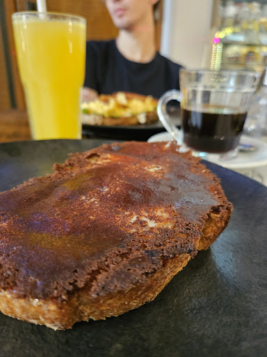 Ele pediu uma torrada excelente de ovos mexidos, bacon, rúcula e cream cheese, eu amei! O café também estava bom, honesto.