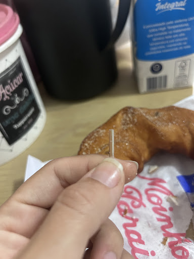 Read moreO ambiente é ótimo, mas os produtos deixam a desejar por falhas graves. Na primeira vez comprei uma rosca e quando cheguei em casa vi que estava mofada, voltei pra devolver e me deixaram trocar por outro produto. Outro dia pedi uma rosquinha, que pra minha surpresa tinha um dente de garfo de plástico dentro dela, como podem ver na foto. Simplesmente não voltarei mais, prefiro não arriscar a...