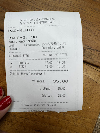 Read moreCoxinha não é oleosa, tempero até é bom, mas é super seca, massa não é de batata. (Coxinha da padaria Monte Líbano na Mooca é muito melhor). Massa do pastel é boa, recheio ok, mas o pastel de feira do Nishida (faz feiras na zona norte) é muito melhor. A pior parte é ser superfaturado, uma coisa é pagar caro e comer bem, outra é comer coisa muito melhor mais barato, ou seja, não vale a pena. Enfim foi a primeira e última vez que comi nessa franquia. Valores Coxinha 17,00 (sem catupiry/requeijao) Pastel 18,00
