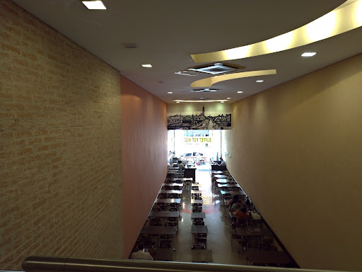 Quiet weigh & pay buffet restaurant in a lively area, with salads, meat kabobs, sushi, pasta & fish.