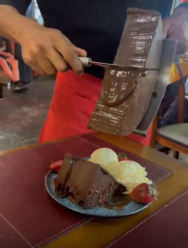 Esse foi, sem dúvida, o pior parmegiana que já comi em toda a minha vida. Assistimos àqueles vídeos enganosos nas redes sociais e parecia ser o melhor parmegiana do mundo. Mas a realidade? Nem de longe chega a ser bom. Chegamos ao restaurante em um sábado, às 11h45, justamente para evitar movimento, já que estávamos com nosso filho de 3 anos. Perguntei ao atendente o que ela recomendaria para três pessoas, e ela indicou o parmegiana de R$ 145,00, dizendo que daria e ainda sobraria. Quando o prato chegou, eu ri de nervoso. Uma quantidade patética, um bife fino como papel, e o tão divulgado prato estava frio e duro! Ok, comemos como deu e ainda pedimos guarnições extras, porque aquele prato serviu só o meu esposo. Quando vamos ao Coco Bambu, Camarões ou até mesmo ao Ímpar, o que é divulgado condiz com o que é servido. Mas nesse restaurante? Nem perto disso. Depois da comida fria e sem sabor, meu esposo me perguntou se eu queria pedir a sobremesa. Resolvi pedir, na esperança de que, pelo menos, o bolo salvasse a experiência. Engano meu. Mais uma decepção! O famoso Bolo Matilda, que custa R$ 45,00, é apenas um pedaço de bolo de chocolate comum, que perde fácil para qualquer fatia da Sodiê. E agora vem a cereja do bolo: se você quiser aquele showzinho que eles tanto divulgam, o derretimento da barra de chocolate na sua mesa, paga à parte, o mesmo valor de outro bolo. Ou seja, bolo + cobertura = quase R$ 100,00.