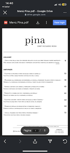 Read moreCheguei no Pina pela seleção de restaurantes a Mastercard. Li algumas opiniões e já levei logo a família toda! Por ser no feriado de 7 de setembro o restaurante estava bem vazio. Os garçons foram super prestativos e nos ajudaram a escolher os pratos. Além do menu principal havia pratos do dia, escritos nas lousas. Muitas opções entre massas simples, recheadas e risotos. Os preços variam de 55-84 reais por prato. Pedimos risoto de camarão com limão, risoto de camarão com ervas, risoto de açafrão com milanesa, tagliatele com funghi e trufa negra, tagliatele de camarão com limão e ravioli de pera com molho de pecorino. Quando os pratos chegaram, UAU, lindos, cheirosos e super bem servidos (eu odeio quando o prato individual não alimenta uma pessoa! No Pina passamos longe disso, S2!). Todos estavam deliciosos, super saborosos e chegaram quentinhos na mesa. O que eu mais gostei foi o risoto de camarão com limão e o tagliatele de funghi, bem marcante, do jeito que eu gosto! O ambiente é muito lindo também, com pratos decorados e orquídeas naturais. Por sermos clientes Mastercard Black, levamos 1 garrafa de vinho com isenção de rolha, os garçons estavam preparados e sabiam do programa. Não teve nenhum questionamento acerca disso. Finalizamos com um gelato italiano de creme com laranja e chocolate. Super recomendo e nos...