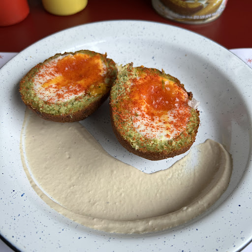 De entrada, o falovo (R$25,00) traz o clássico bolinho de grão-de-bico frito, crocante por fora e úmido por dentro, servido com ovo cozido de gema ainda cremosa e tahine, pasta de gergelim densa e aromática que amarra os sabores com um toque amargo e tostado.