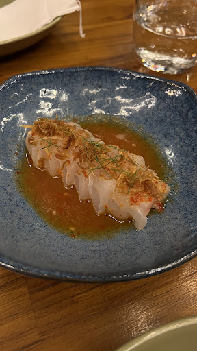 Ao seu lado, o Miang Kham Goon (R$70,00) se faz com folha de chaplu (uma planta tailandesa), camarão, caramelo de tamarindo, coco, amendoim, limão, gengibre, pimentas e ikura (ovas). É uma mordida completa: crocância, dulçor, acidez, calor da pimenta e o estalo salgado das ovas.