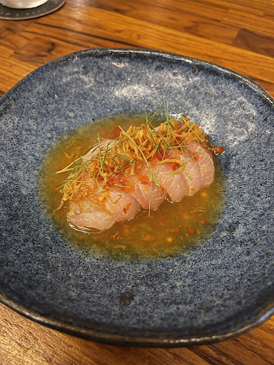 Chim significa “mergulhar”. Refere-se ao ato de passar alimentos em molhos ou pastas antes de comer. Aqui, o Pla Dip (R$73,00) traz um crudo de peixe servido com o molho nahm jim taleh. A maciez do peixe encontra um molho cítrico, picante e doce, profundo em umami e frescor, que invade a boca e prolonga o sabor.