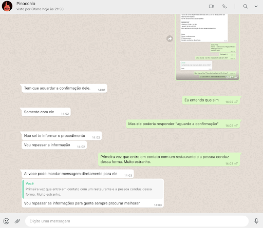 Descaso (e talvez arrogância) no pré atendimento! O pré-atendimento foi o PIOR de todos no mundo pelo qual já passei. Aliás, não me lembro de ter ligado ou enviado mensagem à algum restaurante e ter recebido um atendimento tão amador. O fato de ser um local disputado, não justifica esse descaso e esse desrespeito na reserva. Liguei solicitando uma reserva, e uma pessoa me pediu para enviar no whatsapp. Enviei e em seguida me responderam que o responsável entraria em contato. Entao, um Bruno Galdino me escreveu pedindo os dados da reserva. Respondi na mesma hora e perguntei sobre o horário. A pessoa nao me disse se a reserva era possível ou nao. FIquei no vácuo. Perguntei depois e seguiu sem responder. No dia seguinte, enviei mensagem no whatsapp principal, a pessoa respondeu mas sem poder fazer nada. Enfim! PÉSSIMO! No mesmo dia liguei em outros 5 restaurantes tão ou mais baladados que esse, e onde nao era mais possível reservar, a pessoa simplemente disse que nao poderia. Como em qualquer outro lugar. Pessoas que conheço e já foram elogiaram bastante tanto os drinks quanto os comes do local.E u mesma não posso opinar sobre comida, bebida e atendimento no local porque nao fui (e depois desse pré-atendimento, perdi a vontade, e vou seguir indo aonde sou tratada com respeito do começo ao...