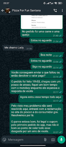 Além da pizza ser extremamente cara, vem crua e fria. Entrei em contato com a central de atendimento reportando o ocorrido, solicitaram fotos e seguiram com a opção de envio de uma nova pizza. Aguardei +30min e nada da pizza, me enviaram foto antes de sair com o pedido de uma pizza que não condizia com a que eu havia pedido, referi o erro novamente e solicitei o cancelamento. Isso depois de MUITAS ligações e trocas de mensagens no WhatsApp. Me passaram que o reembolso seria em 6 dias (???) obviamente recusei e solicitei reembolso IMEDIATO. Em resumo, aguardei 3h totais para comer uma pizza que ainda tive que esquentar no meu forno de casa. Absurdo!