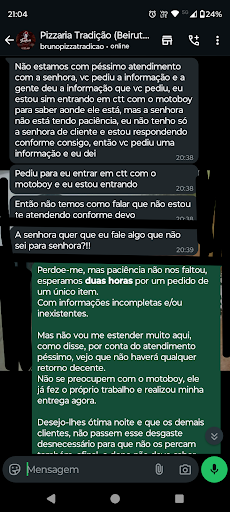 Experiencia péssima, por conta exclusivamente do ATENDIMENTO do local. Pedi apenas um beirute às 18h38 via Ifood, previsto para entregar emtre 19h18 e 19h28. Solicitei pelo próprio ifood uma nova previsão, onde estenderam o prazo por mais 15 minutos (ate 19h57), achei razoável e aguardei. Às 20h09, nada do pedido, entrei em contato via WhatsApp solicitando maiores informações, onde a equipe apenas me justificou dizendo que "o chapeiro atrasou mas o pedido ja tinha saído". Aguardei alguns minutos e cobrei posicao novamente, onde me responderam o que consta nos prints. Caso o proprietário tenha acesso à essas avaliações, sugiro realmente que ele reveja sua equipe de atendimento, trocando ou efetuando um treinamento adequado. Minha família e eu somos clientes à muito tempo. E quando falei para a atendente que muitos clientes deixam de pedir e que nos perderiam por conta disso, responderam apenas com um "👍🏻" Meu pedido chegou 20h40, e só recebi pq era para o meu filho, que ja estava esperando com fome...