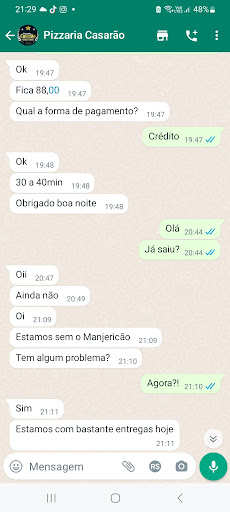 Não sei quem atende o WhatsApp mas atende muitooooo mal e isso é uma pena porque a pizza é muito boa porém Não vale a pena o trastorno do atendimento NUNCA chega no prazo, e hoje só depois de mais de UMA HORA que efetuei o pedido o atendente do wattssap me informou que não tinha o ingrediente principal da pizza que pedi, aceitei mesmo assim e minha entrega só foi feita após DUAS HORAS que efetuei o pedido e mesmo faltando ingredientes a pizza saiu o msm valor descaso total. Tive que aceitar porque o demoraram tanto que naquele horário nao ia conseguir pedir mais em outro lugar, mas Perderam...