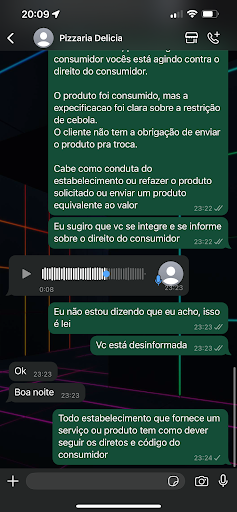 Para minha surpresa, a atendente recusou minha sugestão, alegando que produtos alimentícios não podem ser trocados e que a pizzaria não segue o Código de Defesa do Consumidor. O atendimento foi encerrado abruptamente quando a atendente bloqueou meu número no WhatsApp, o que me impediu de seguir com a reclamação ou buscar uma solução.