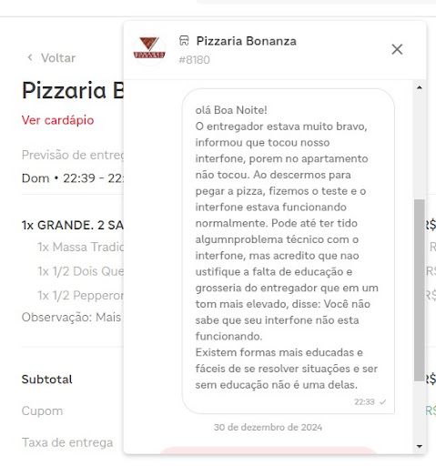 A conduta do entregador foi inaceitável: além da falta de educação evidente, demonstrou despreparo para lidar com situações simples, como utilizar o interfone corretamente. Ressalto que o entregador em questão é funcionário da pizzaria, e não de um serviço terceirizado como o iFood.
