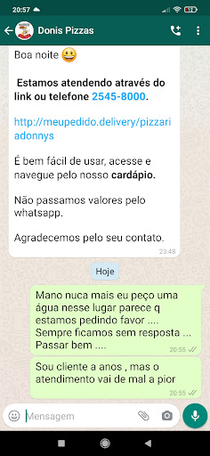 Eu sempre peço produtos variados na Donnys, quando gosto de um lugar me fidelizo a ele. Mas essa história mudou desde ontem. Tenho notado um certo desdém quando faço pedidos, dá impressão que alguns funcionários não gostam! Geralmente a atendente é seca e transmite isso no seu tom, apressando o pedido, dando a impressão de incômodo e falta de vontade. O motoboy que costumava trazer é um amor, a educação em pessoa, mas infelizmente no último pedido o grosseiro que trouxe foi arrogante, dizendo que estava há 10 minutos esperando, o que obviamente foi um baita exagero. Mas se fosse, qual o problema em esperar já que o recebi com uma bebê de colo, extrema falta de empatia e educação. Ainda por cima ficou parado no meu portão após a entrega durante uns minutos, com a cara no celular. Se estava com tanta pressa que até foi grosseiro porque ficar parado na porta?! Como existem outras pizzarias tão boas quanto a Donnys, a partir de hj não peço mais na Donnys. Peço desculpas apenas ao motoboy que não sei o nome, ele sim faz o serviço direito. Quanto às atendentes e o outro motoboy, aprendam a lidar...