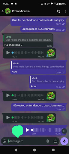 Achei um descaso total , pedi uma pizza de um sabor e mandaram outro sabor já no fim da noite ,e pelo informativo a pizzaria já estava fechada não tendo como resolver a questão, criança esperando pra comer a pizza 🍕 já beirando 00:00 , aí mandei msg e a atendente foi desagradável na solução do caso , já disse que não mandara outra pizza 🍕,por que eu já estava comendo essa ,, o motoboy foi gentil e até tentou alguma diálogo de solução mas a pizzaria foi inconsequente e não apresentou nenhum tipo de satisfação pelo seu erro e ainda quiz contradizer por eu ter comida a pizza ,,,, .... É um cliente entre outros que não compraram mais aí . Uma questão simples de resolver . E outra questão,não foi a primeira vez que isso acontece, mas agora é a primeira e última . Fez um Pix de...