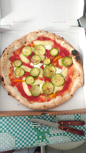 O cardápio descrevia uma pizza com lâminas de abobrinha, queijo de cabra e tomatinhos. Vieram uns toletes de abobrinha cortados em rodelas tão grossas que quando mordi estavam ainda geladas por dentro. Tomatinhos devia ter uns 2, cortados em 4 fatias cada e espalhados por toda a pizza. A pizza, que no cardápio dizia que vinha cortada em 4 fatias, não veio cortada. A loja estava sem tortano, sem soda italiana, sem suco, só tinha refrigerante e água.