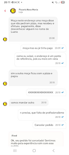 Read morePéssimo! Solicitei uma entrega pelo Ifood, porém um pouco antes do prazo de entrega acabar eles mandaram mensagem avisando que o motoboy estava esperando, fiquei em frente da casa 15 minutos esperando e nada do motoboy, como estava frio eu entrei, mandei mensagem pelo chat, e passando um tempo depois do prazo de entrega se encerrar eles me informam que entregaram a pizza para outra pessoa, sendo que eu já havia deixado pago pelo aplicativo, falta de...