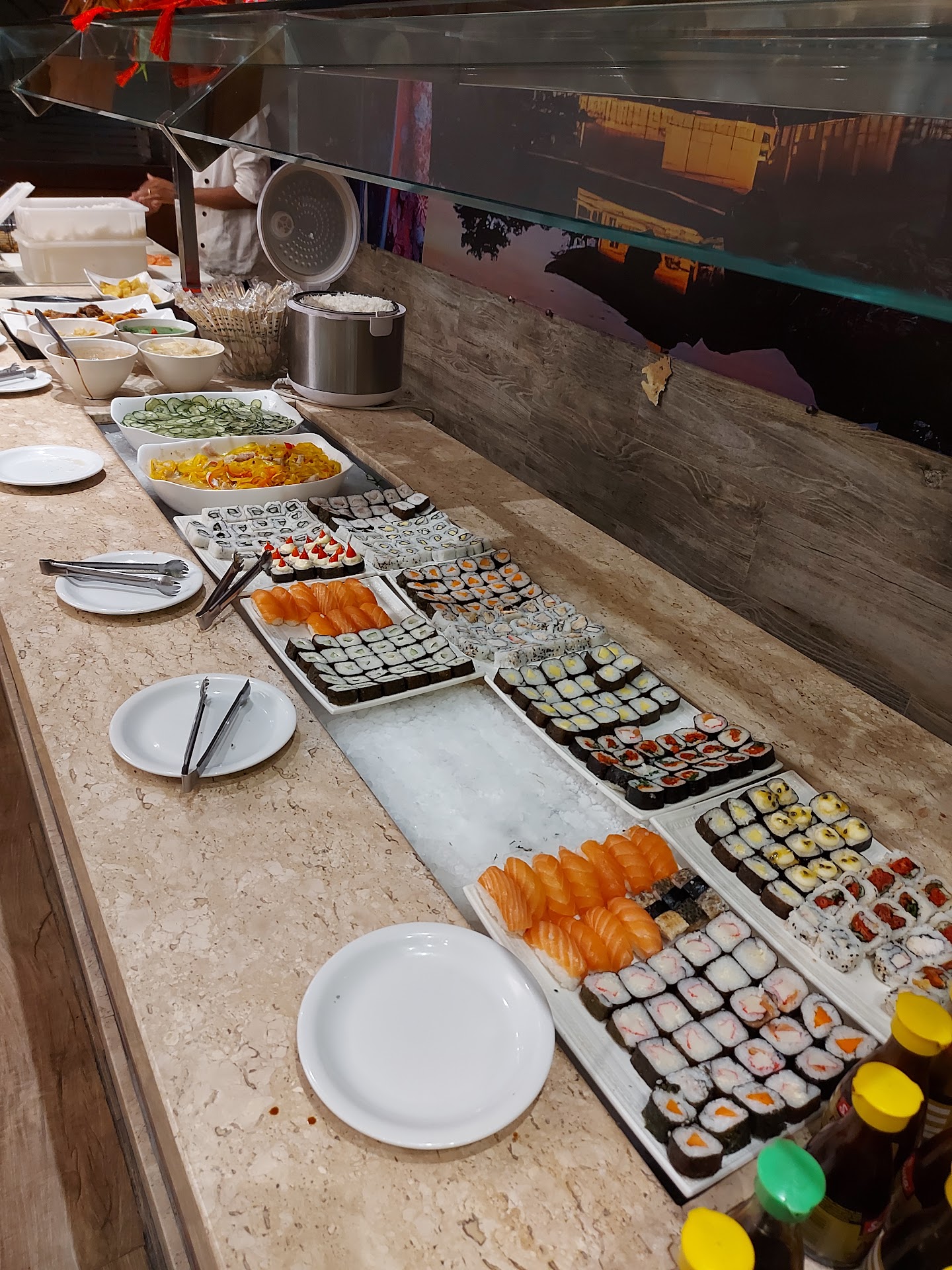 Buffet oriental servido exclusivamente com opções vegetarianas, aparentemente, pois todos os sushis continham apenas cenoura ou pepino (após conversado com o gerente, o buffet foi reposto, desta vez com niguiri de salmão), porém, mesmo assim, o shari (arroz japonês temperado para sushi) claramente estava mal preparado, sem tempero (molho su) e até mesmo cru. Fora o aspecto gelado de todas as peças, o que entrega a falta de frescor no preparo. Ok, é uma churrascaria, mas, se o ambiente se propõe a servir comida oriental, espera-se a mesma qualidade dispensada ao preparo dos demais pratos da casa, mas não é o que vemos neste setor.
