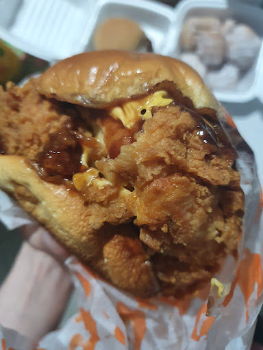 O lanche em si é uma delícia. Mas costuma vir errado pelo uber eats. Já pedimos sem pimenta e veio com pimenta, já veio faltando item, já pedimos sem cebola e veio com... Meio desorganizado. O frango empanado é muito bom, mas em alguns pedaços não estava bem empanado e aí tava sem casquinha, só o frango mesmo... Porém vale MUITO à pena, muito mesmo, o gosto é maravilhoso, inclusive de lanches de frango Popeyes é meu favorito, ganha até do KFC. O lanche é enorme e o combo não é caro pro tamanho. Paguei menos de 35 reais e mal aguentei o lanche, quanto mais a batata, ficou inteira pra comer dps. No meu caso chegou bem rápido, não atrasou não. Só tirei estrela pela desorganização e pela questão...