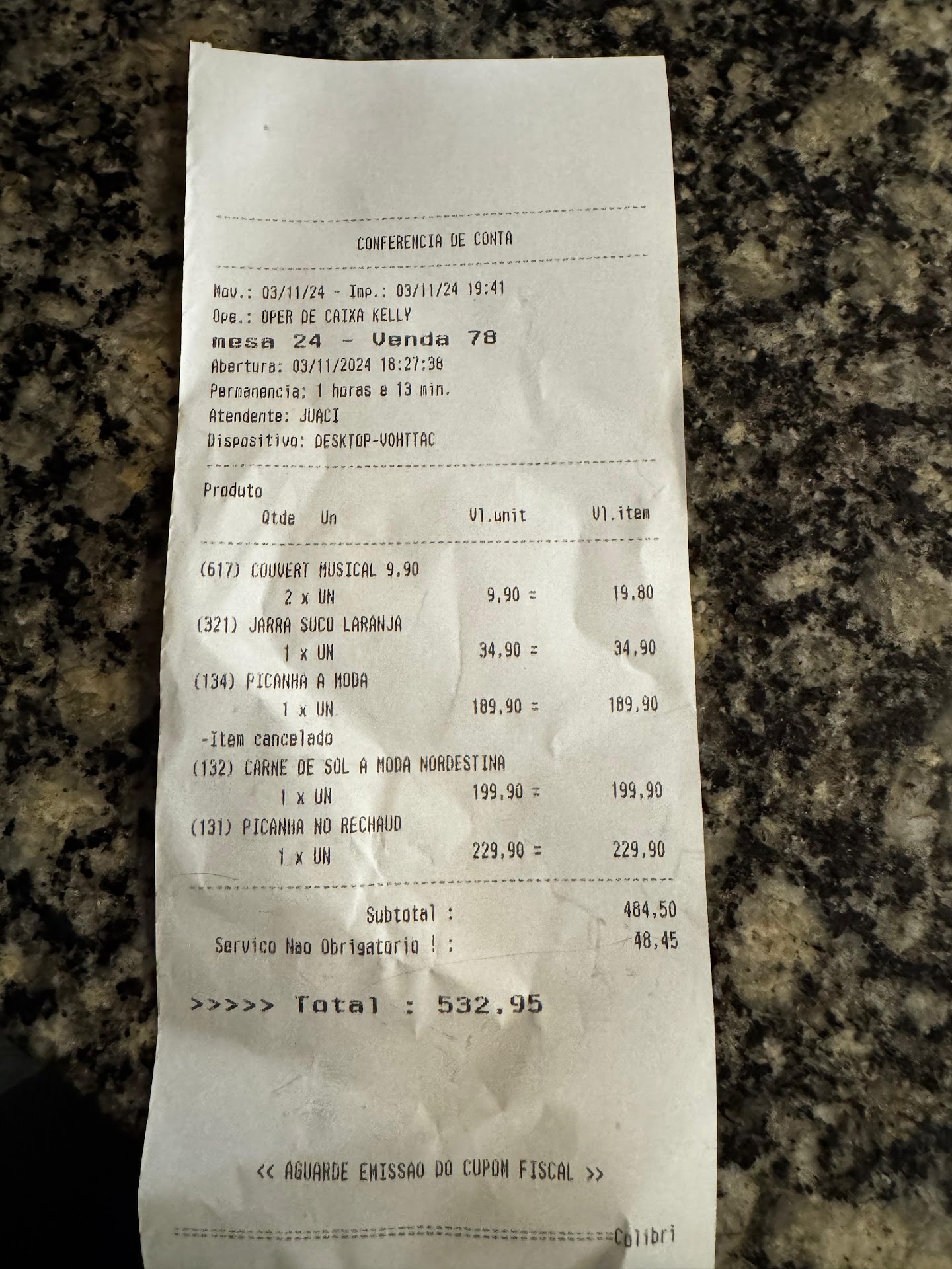Read moreLlegamos mi pareja y yo y nos sentamos en la mesa más chica que había. Nos pusimos a leer la carta y no la terminamos de leer que el mesero ya nos estaba apurando para pedir. Pedimos dos platos creyendo que las porciones eran para una persona y resulta que eran como para 2 o 3 personas cada plato. El mesero nunca nos dijo esto y en la carta tampoco lo decía. Un desperdicio de comida. El mesero nos dijo “pensé que venía más gente” y que por eso no nos dijo nada, siendo que éramos dos personas en la mesa más chica. La comida, más salada que el mar muerto y la carne, sin ser la picanha, durísima. Al final, le pedimos la cuenta y ahí mismo te aparece el precio de lo que consumiste y el precio con la propina, que en el papel te dice que la propina no es obligatoria. El mesero nos quería obligar a pagarle la propina cosa que no hicimos y que además se enojó por esto. Menos mal llevamos efectivo, porque nos quería cobrar con tarjeta y ahí te meten el precio con propina si o si. Me iba a llevar la boleta y el mesero no quiso que me la lleve y le sacamos una foto. También, cuando no estábamos yendo nos pedían un “papel de salida” o no se qué cosa ya que somos turistas (no hablamos portugués) pero por suerte nos dejaron ir. Fuimos a pasar una linda noche y nos la terminaron arruinando solo por rascar unos reales por ser turista....