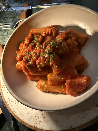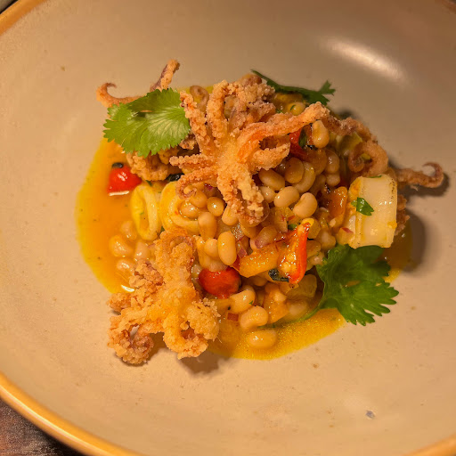Para começar, o vinagrete de lula (R$62,00) vem com feijão manteiguinha, pimenta biquinho na brasa, coentro e tentáculos de lula fritos. O feijão traz uma base suave, tentáculos fritos entram com textura crocante e com salinidade, a pimenta biquinho adiciona um dulçor leve e um aroma tostado, e o vinagrete equilibra o conjunto com acidez.