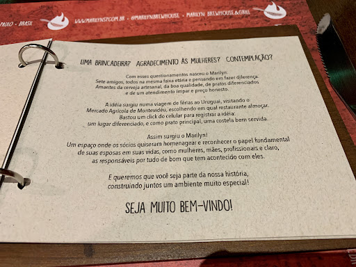 Na verdade, a criação veio de uma brincadeira, talvez um agradecimento as mulheres ou até uma contemplação! Foi assim que nasceu o Marilyn, a ideia de sete amigos, todos da mesma faixa etária e tendo vontades incríveis em fazer o diferente, são adoradores de cervejas artesanais e bons bebedores. Prezam pela qualidade de tudo que é oferecido aos clientes, desde os excelentes cortes de carnes e suas cervejas artesanais, que são produzidas em Santo Antônio do Pinhal e existem nove torneiras dessas delicias na casa.