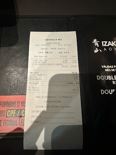 Read more139 reais por um rodízio (julho/2023). É muito? Com certeza, impossível pagar isso normalmente por uma refeição. É a melhor comida japonesa que eu já comi? Também não. As opções apresentadas miram a qualidade apresentada por lugares como o Kome (Bela Vista), mas o resultado é um tanto quanto aquém do esperado. Pensando assim, é de se refletir por que a opção acaba ganhando a 5ª estrela de avaliação, mas o que o Aoyama Perdizes deixa a desejar na qualidade comparativa pelo preço, entrega de sobra em qualidade de serviço e opções disponíveis. Falando em experiência de rodízio, é a melhor que eu já tive. O cardápio é absurdamente extenso e dá vontade de sair provando tudo das boas opções apresentadas. Algumas são bem curiosas e criativas, outras sazonais e poucas completamente comuns. Basta pegar o cardápio para escolher o que vai pedir em seguida e algum garçom já chega para retirar o seu pedido. Diferentemente de qualquer outro rodízio, o pedido chega rápido (com exceção de pratos quentes, mas a espera ainda é longe da repetição que você for pedir em qualquer outro rodízio por aí). É uma diversão ficar experimentando várias coisas e sair muito satisfeito. Vale pensar de controlar o impulso inicial da casa de já sair servindo as coisas comuns de entrada. Tem tantas opções interessantes no cardápio e diversas deliciosas e realmente dignas do preço exorbitante que é cobrado que você não deveria ficar perdendo espaço do seu estômago com isso. Educação e disponibilidade dos garçons completamente nota 10. O rodízio não inclui sobremesa, e já saiba que elas e as bebidas carregam um preço salgado. Evite a região em dia de partida no Allianz Parque, confira antes se o Palmeiras joga em casa. Vagas na rua não são impossíveis normalmente, mas podem ser bem difíceis de encontrar em...